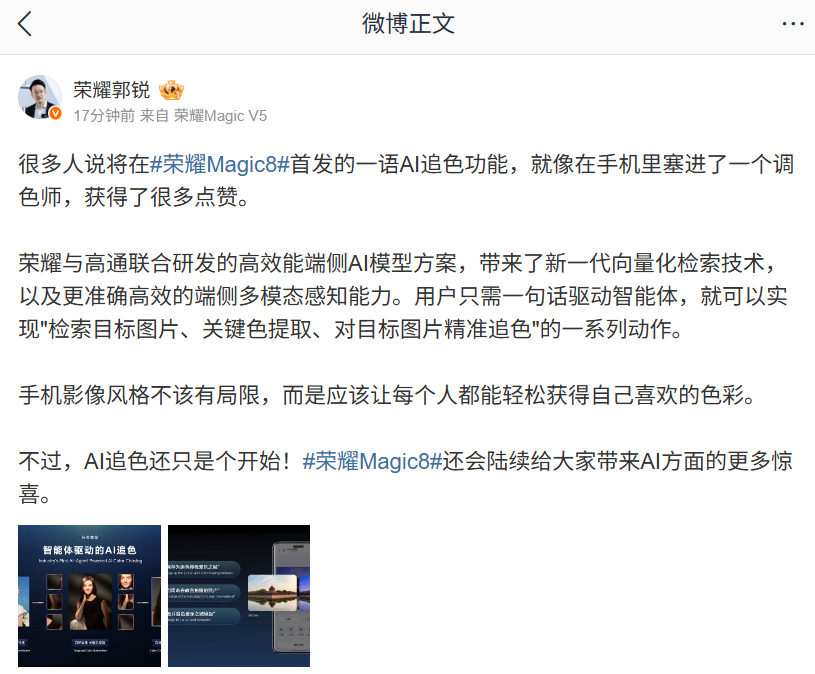 郭锐表示,手机影像风格不该有局限,而是应该让每个人都能轻松获得自己喜欢的色彩。AI 追色还只是个开始。Magic8 还会陆续给大家带来 AI 方面的更多惊喜。