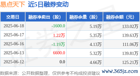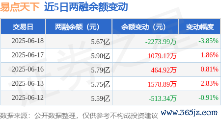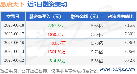 本站消息,6月18日,易点天下(301171)融资买入3173.62万元,融资偿还5441.0万元鼎际之家,融资净卖出2267.38万元,融资余额5.66亿元。